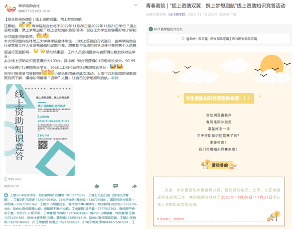 为积极宣传国家资助政策与成效,充分展示我院学生在国家资助政策帮助下自立自强、明德感恩的青春风采,进一步营造形式多样、积极向上的校园文化氛围,结合我院实际,学院于2022年11月20日至11月21日举办了线上资助知识竞答活动。