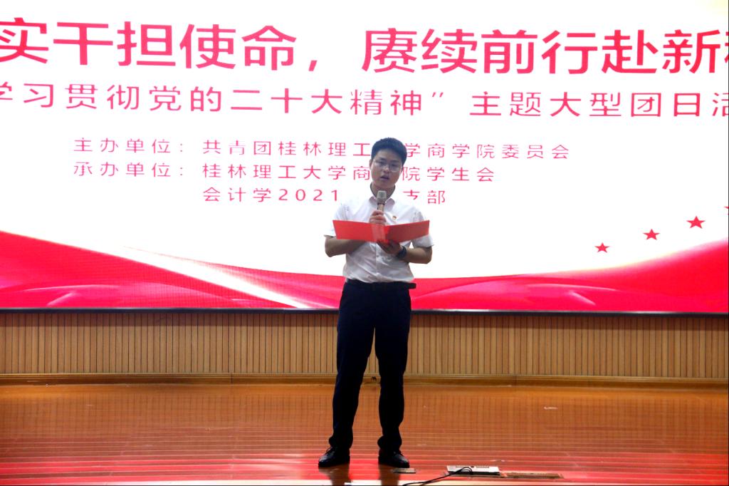 为深入学习宣传贯彻党的二十大精神,5月21日晚,我院会计学2021-3团支部于雁山校区图书馆报告厅举办“笃行实干担使命,赓续前行赴新程”主题大型团日活动。学院团委书记宋海民,2021级辅导员庞如雪、王贤,2022级辅导员胡嘉议、黄佳玲和黄维出席本次活动,各团支部支委及青年学生代表共计200余人参加本次团日活动。