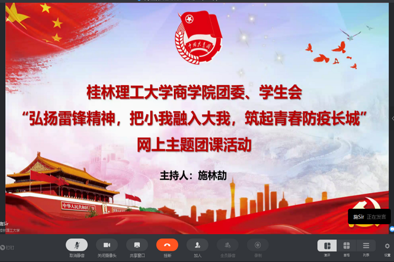 为大力弘扬雷锋精神,引导广大团员同心协力,共克抗疫时艰,324日下午,我院举办了“弘扬雷锋精神,把小我融入大我,筑起青春防疫长城”网上主题团课活动。我院团委、学生会指导老师覃泰树老师出席本次活动,商学院团委、学生会全体成员参加此次活动。本次团课通过钉钉网络会议平台举行,我院团委副书记施林劼老师主持本次团课。