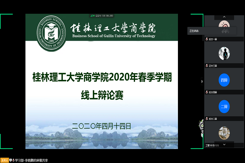 为了丰富同学们单一的宅家生活,展现出疫情期间当代大学生朝气与活力,我院于414日下午举办了2020年商学院春季学期线上辩论赛。外国语学院辩论队队长金奕仰、理学院辩论队技术指导陈钦毅、商学院辩论队副队长魏彦旭担任比赛评委。本次辩论赛通过腾讯会议举办,我院部分同学观看了比赛。