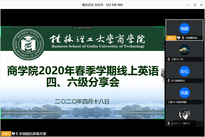 为进一步提升我院学生英语四级、六级的复习效率,提高我院英语四六级通过率,我院于418日在腾讯会议APP举办2020年春季学期线上英语四六级分享会。我院2019级辅导员覃泰树老师出席本次分享会,共由四位学生代表:会计学2017-3班谭羽君、人力2018-1班祝蓝婷、2019-2班辛皓楠、物流2019-1班刘卓辰进行分享,分享会由我院学生会学习部成员严洁主持。