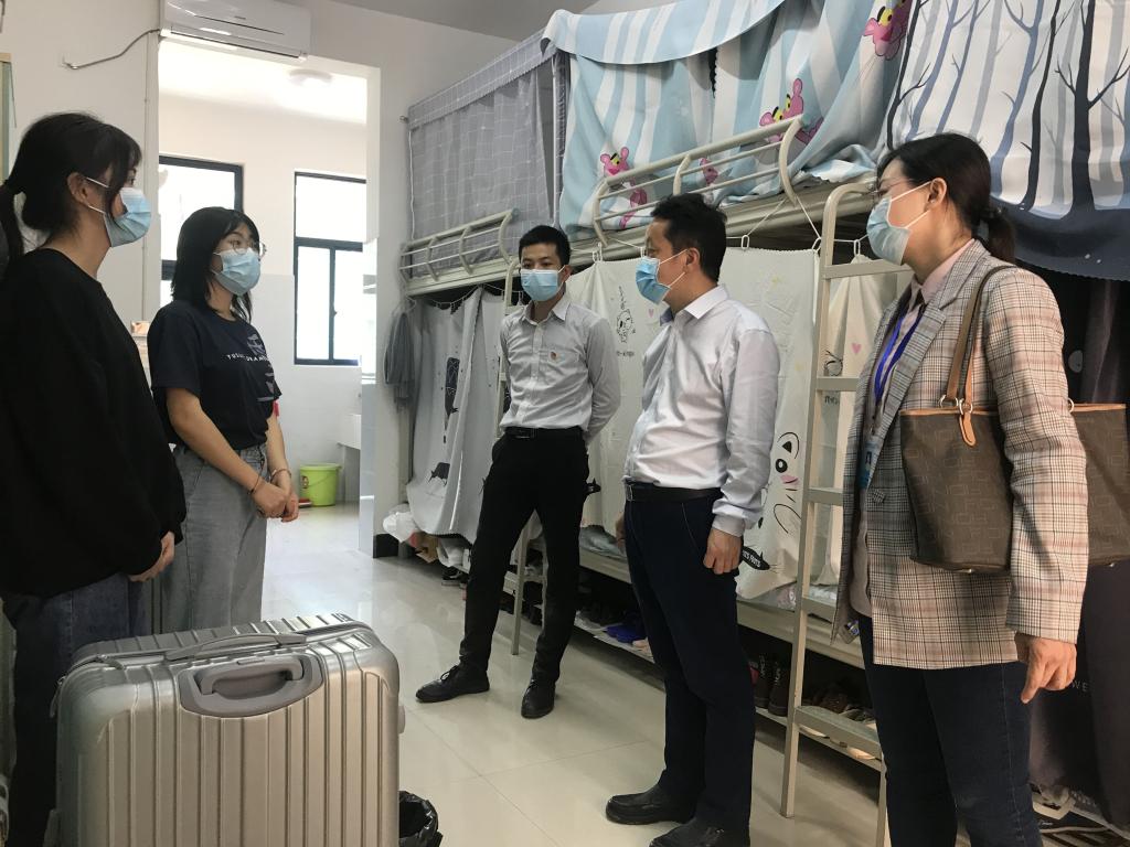 为了做好校园疫情防控工作,了解返校学生的身体、生活情况以及思想动态,4月27、28日下午,学院院长曾繁荣总会计师、党委书记白永生、党委副书记沈菲菲、副院长贺正楚、蒙永亨在各年级辅导员的陪同下走访学生宿舍看望学生。