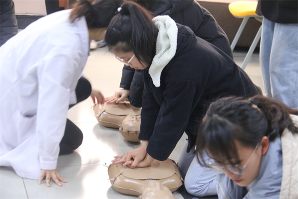 培训伊始,在武萌医生的带领下,全体师生观看心肺复苏教学视频。武萌老师基于视频内容讲解了应急救援、紧急避险的相关知识以及急救的要点,并强调心肺复苏施救的必要性与重要意义,重点介绍了心肺复苏紧急救护的基本原则、方法与步骤,详细分解了每个步骤的操作要领。随后,由20名桂医星火急救队队员分组带领学员们进行心肺复苏实操练习。