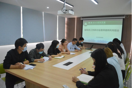 为推动辅导员师德师风建设,商学院于4月8日在屏风校区教七栋二楼会议室召开辅导员工作研讨会暨师德师风专题会。会议由学院党委副书记沈菲菲主持,全体辅导员参加会议。