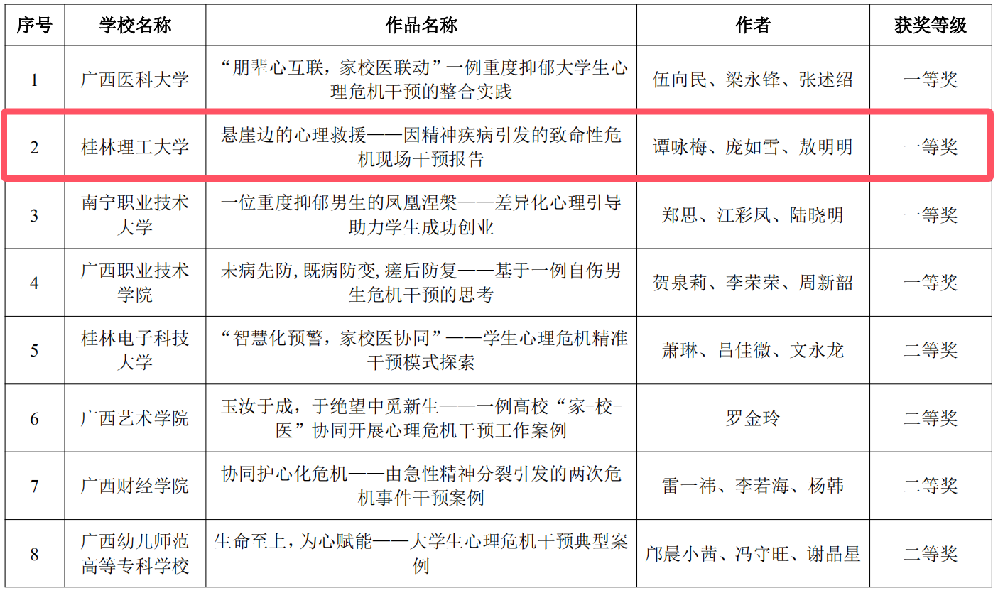近日,在自治区教育厅公布的2024年全区高校大学生“3•25”心理健康教育活动季活动获奖评选结果中,我院报送的心理危机干预类案例:《悬崖边的心理救援——因精神疾病引发的致命性心理危机现场干预报告》荣获2024年全区高校大学生心理健康教育典型案例一等奖,选送学生庞月霞参加朋辈心理辅导技能大赛荣获团队三等奖。