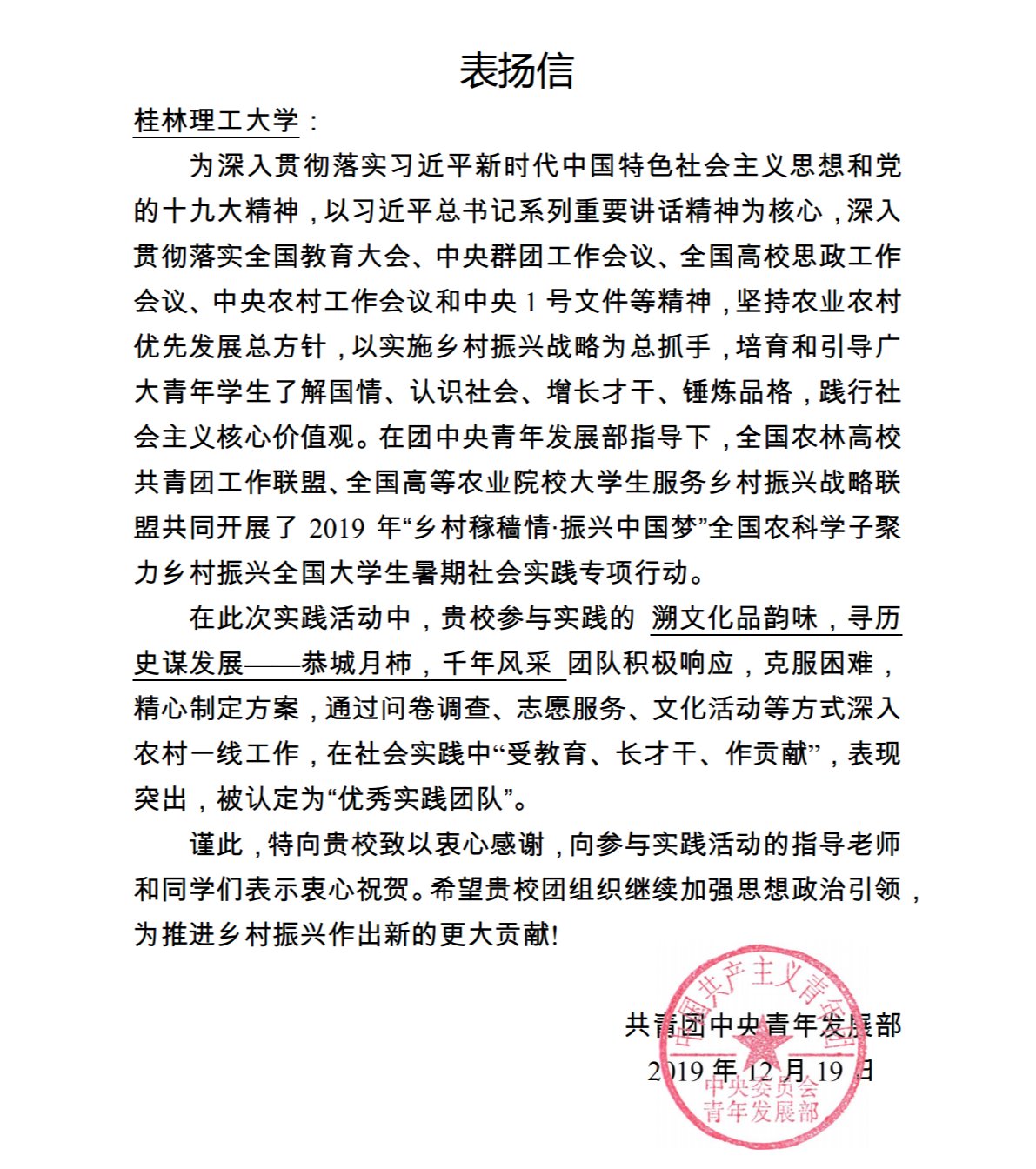 在团中央青年发展部指导下,全国农林高校共青团工作联盟、全国高等农业院校大学生服务乡村振兴战略联盟共同开展的2019年“乡村稼穑情·振兴中国梦”全国农科学子聚力乡村振兴全国大学生暑期社会实践专项行动中,我院学生骨干组成的“乡科聚力美丽广西柿味兴城”专项实践团获评“优秀实践团队”,共青团中央青年发展部近日专门向学校发来表扬信。