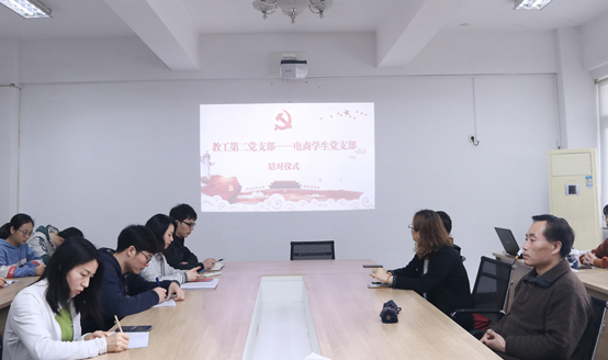 会议伊始,教工第二党支部与电商学生党支部举行结对仪式,两个支部的支部书记罗薇老师和杨继理老师分别对两个支部的基本情况进行了介绍,同时发布两个支部结对共建的草案。教工第二党支部李隽波同志和电商学生党支部袁强同志针对两个支部结对共建提出创新性的设想。接着,由罗薇同志带领全体与会同志进行“学党史、强信念、跟党走”学习教育。两个支部的同志分别结合自己的入党的初心,讲述了自己的经历与感悟,鼓励大家自觉把个人理想追求融入到党和国家的事业之中。最后,由教工第二党支部书记罗薇老师进行总结,她指出:“创新党史的学习方式有利于同志们提高对党史学习教育的热情,有助于深入展开支部党建工作。同时也希望支部学生能够将党史学习教育融入实践,加强师生交流,提高本领,起到党员先锋模范作用。”
