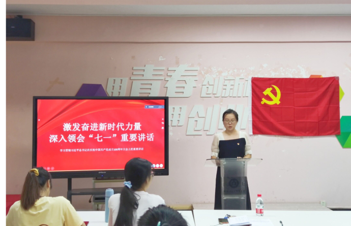 首先,支部书记梁译匀老师做了题为《激发奋进新时代力量,深入领会“七一”重要讲话》的主题党课,带领支部同志重温习近平总书记在庆祝中国共产党成立100周年大会重要讲话内容,分别从“四个伟大成就”、“中国共产党的伟大建党精神”、“九个必须”以及“寄语广大青年号召全体党员”四个内容进行授课,并鼓励支部同志树立坚定理想信念,充分发挥党员的先锋模范作用,增强做中国人的志气、骨气、底气。随后,组织党员观看“七一勋章”获得者张桂梅老师先进事迹视频向先进人物学习,同时支部成员结合假期参与家乡疫情防控工作以及担当新生迎新志愿者的感悟进行了分享,让支部成员在学思践悟中坚定理想信念,在奋发有为中践行初心使命。