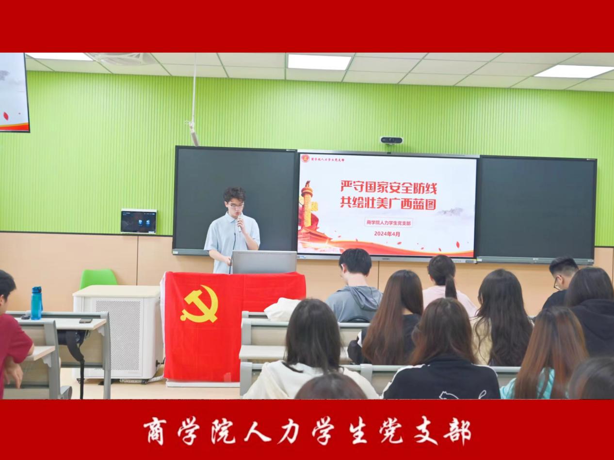 为进一步学习贯彻习近平新时代总体国家安全观,让广大青年学子正确理解及深刻把握总体国家安全观的重要性,切实履行维护我国家安全的义务,2024年4月22日,商学院人力学生党支部在雁山校区06305教室及风雨操场开展了“严守国家安全防线,共绘壮美广西蓝图”主题党日活动。