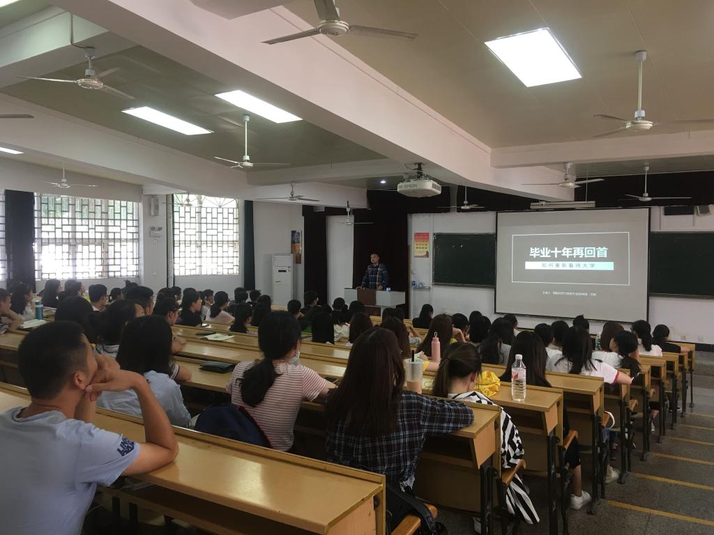 10月7日,我院邀请碧桂园集团品牌部总监,我校2009届国际经济贸易毕业生吴峥回校开展题为“毕业十年再回首”的优秀校友系列分享讲座,共有220余名学生参加了讲座,学院学工组长曾丽萍和国贸专业教研室廖俭老师出席讲座。