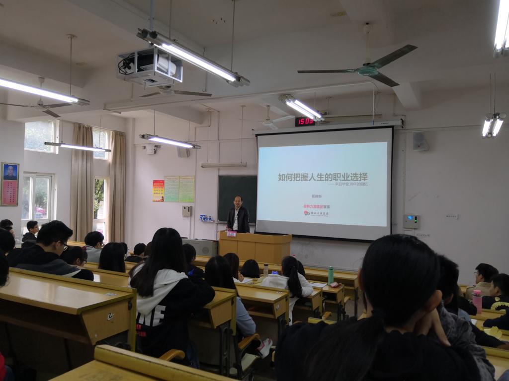 10月23日,我院邀请桂林力源粮油食品集团董事会董事,我校2008届毕业生杨建新回校开展题为“如何把握人生的职业选择”的优秀校友系列分享讲座,共有120余名学生参加了讲座,学院学工组长曾丽萍出席并主持了讲座。