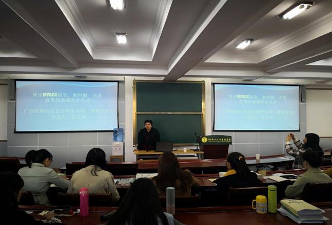 2019年11月19日,MPAcc校外实践导师、广西桂林恒信会计师事务所所长符文凤高级会计师在商学院7411教室举办了《展望MPACC前景,如何做一名复合型的高端会计人才》的专题讲座。商学院MPACC中心主任李延莉老师主持此次讲座、全体2019级MPAcc同学聆听了此次讲座。