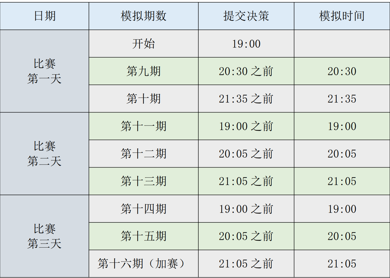 一般来讲,每场比赛选手需要经营企业7-8个季度,在最后一个季度时,根据比赛成绩随机决定是否结束。该方法使比赛更具有挑战性和不确定性,避免了个别选手的短期行为;无人能事先控制比赛终止,避免组委会作弊或偏向可能。