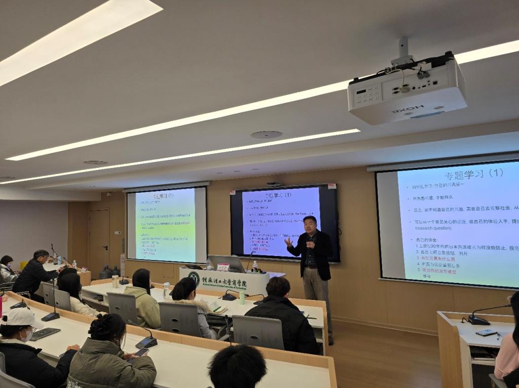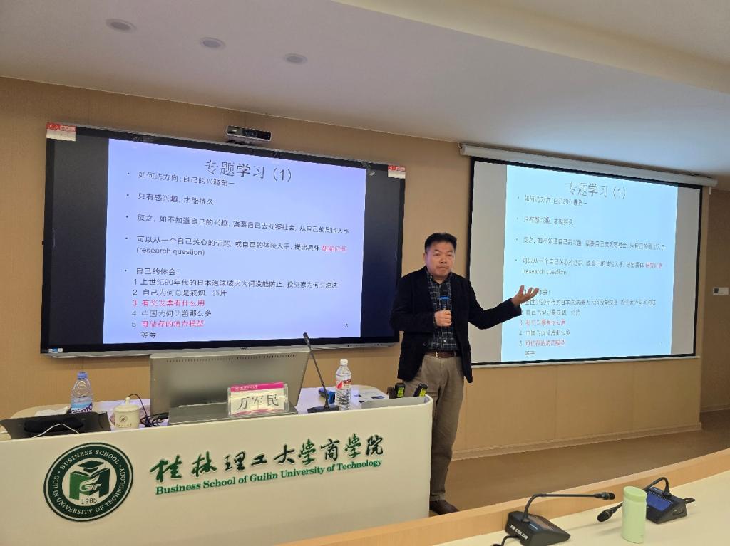 2024年12月23日上午,北京大学新结构经济研究院客座教授、日本福冈大学经济学院教授、博士生导师万军民教授在商学院7307教室做了题为“研究生的论文写作——以研究消费和投资为例”的学术讲座。商学院硕士研究生参加了本次讲座活动,讲座由学院副院长王兴中主持。