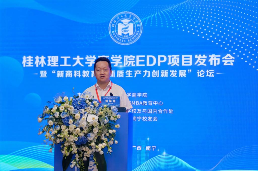 6月2日,学校EDP项目发布会暨“新商科教育与新质生产力创新发展”论坛在南宁隆重举行,本次活动由我院主办,MBA教育中心承办,校友与国内合作处、南宁校友会协办。学校党委常委、总会计师曾繁荣出席活动并致辞,自治区科技厅原党组书记、厅长陈大克出席活动,广西日报、兄弟高校专家学者、企业、校友代表和学校校友与国内合作处、商学院等相关负责人及师生代表等100多人参加。活动由学院党委书记白凌婷主持。