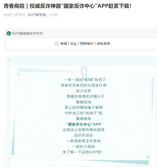 为提高师生对电信诈骗手法的识别和防范能力,2021年6月,我院通过线下和线上等方式广泛开展了防范电信诈骗宣传教育活动。 线下活动中,学院充分利用晚教育课堂教学的主渠道,借助“国家反诈中心”APP等各类教育资源和...