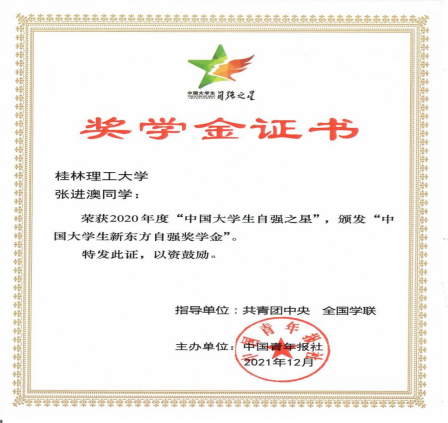 近日,由共青团中央、全国学联指导,中国青年报社、新东方教育科技集团联合开展的2020年度“中国大学生自强之星”奖学金评选活动结果揭晓。我院学生张进澳荣获2020年度“中国大学生自强之星”荣誉称号,并获得“中国...