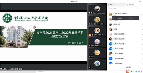 3月18日,商学院组织辅导员召开安全稳定研讨会,会议由学院党委副书记沈菲菲主持,屏风校区辅导员通过钉钉线上参会。 会上,沈副书记带领全体辅导员学习近期全国、全区、桂林市及学校疫情防控会议精神,全面总结开学...