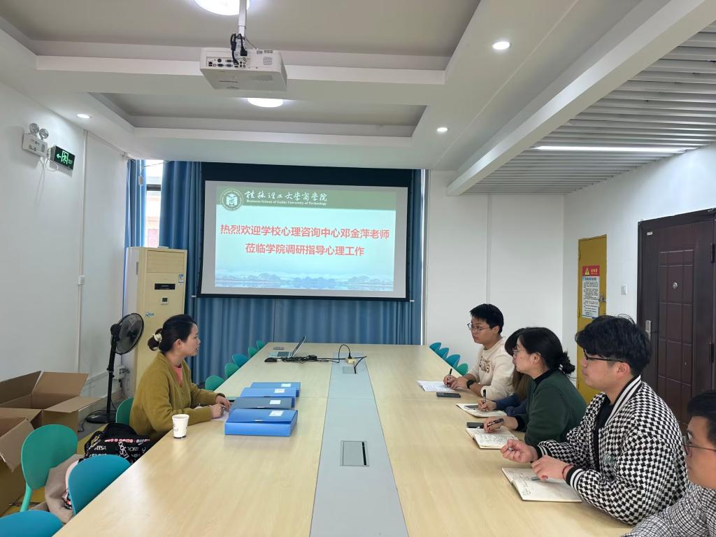 3月9日下午,学校心理健康教育与咨询中心专职教师邓金萍莅临我院调研指导心理工作。本次座谈会在雁山校区07501会议室召开,学院雁山校区全体辅导员参加会议。 会上,学院分管心理健康教育工作老师王贤首先对心理健康...