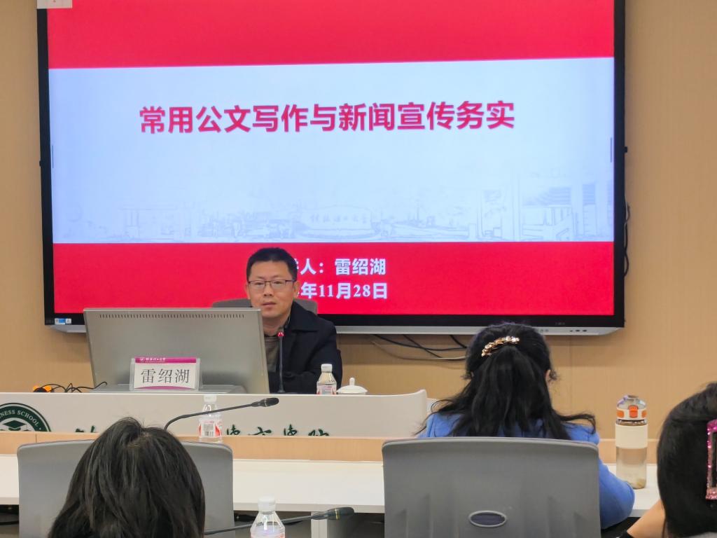 11月28日,学院邀请学校党委宣传部副部长雷绍湖在屏风校区7311教室作《常用公文写作与新闻宣传》专题培训。学院各科室负责人、教研室主任或副主任、组织员、各师生党支部书记、全体党政办成员、全体辅导员、MBA教育中心和MPAcc教育中心全体管理人员参加培训。本次培训由学院党委副书记、纪委书记饶蠡主持。雷绍湖首先介绍了公文写作和新闻宣传工作对于推动学院高质量发展和个人成长的重要性,并通过大量的实际案例和自己的工作...