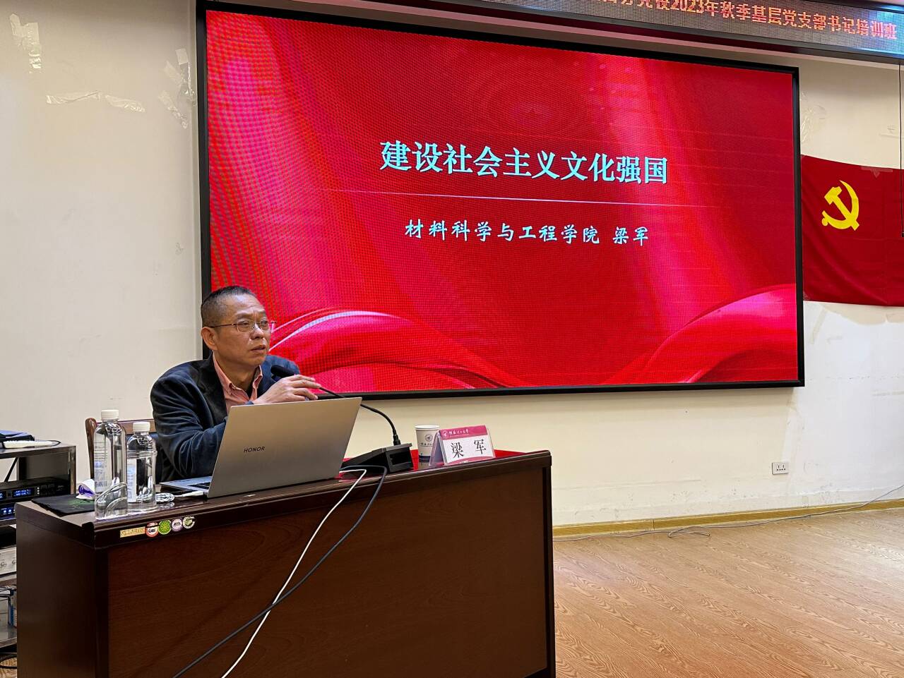 为深入学习贯彻习近平新时代中国特色社会主义思想和党的二十大精神,切实提高党支部书记的党务工作水平和履职能力。11月20日下午,材料科学与工程学院党委书记梁军同志在屏风校区4204会议室,为商学院、土木工程学院和材料科学与工程学院党支部书记讲授题为《建设社会主义文化强国》的专题党课,以上三个学院全体党支部书记参加。梁军同志围绕《建设社会主义文化强国》这个主题,从为什么建设中国特色社会主义文化、为什么要用...