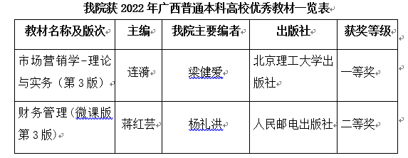 近日,自治区教育厅印发《自治区教育厅关于公布2022年广西普通本科高校优秀教材评选结果的通知》(桂教高教〔2022〕46号),我院连漪教授、蒋红芸副教授两位老师主编的教材分别获得广西普通本科高校优秀教材一等奖、...