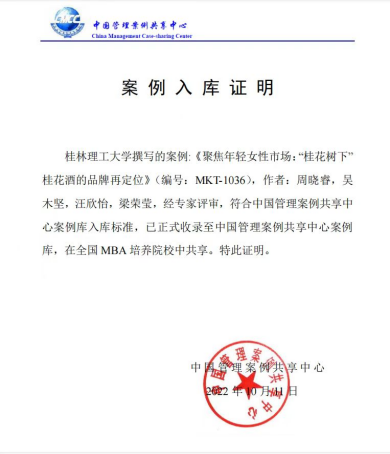 近日,我院周晓睿副教授作为第一作者开发的案例《聚焦年轻女性市场:“桂花树下”桂花酒的品牌再定位》(编号:MKT-1036),通过专家评审,成功入选“中国管理案例共享中心案例库”。中国管理案例共享中心是在全国工...