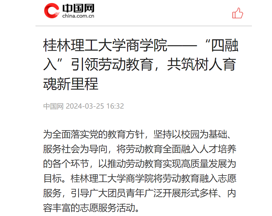 3月25日,中国网以“beats365(中国区)-唯一官方网站商学院——‘四融入’引领劳动教育,共筑树人育魂新里程”为题,宣传报道了我院将劳动教育融入志愿服务,引导广大团员青年广泛开展形式多样、内容丰富的志愿服务活动。原文链接如下:https://t.m.china.com.cn/convert/c_yyJrlOWy.htmlbeats365(中国区)-唯一官方网站商学院——“四融入”引领劳动教育,共筑树人育魂新里程为全面落实党的教育方针,坚持以校园为基础、服务社会为导向,将劳动教育全面融入人才培养...