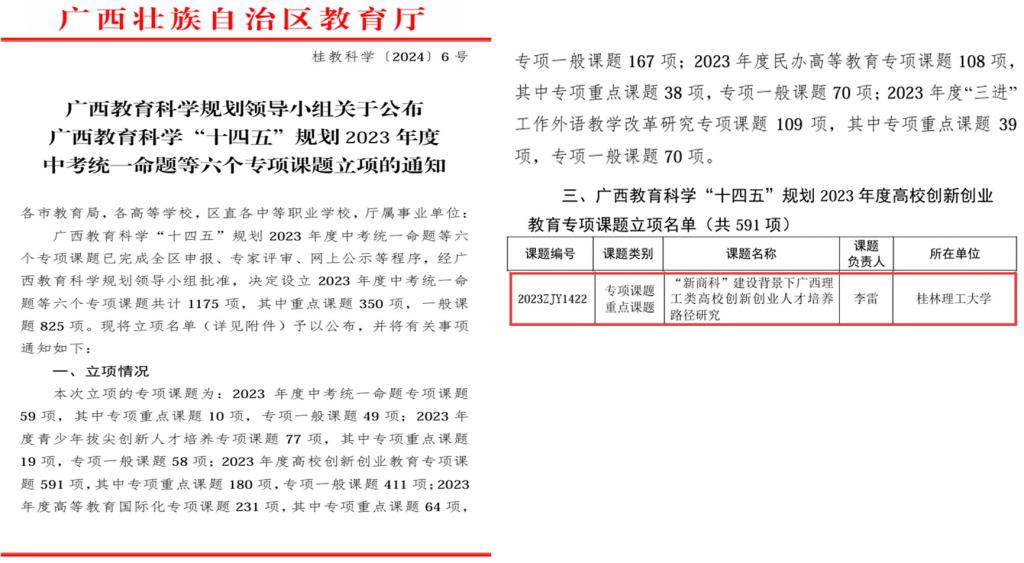 近日,自治区教育厅公布了《广西教育科学规划领导小组关于公布广西教育科学“十四五”规划2023年度中考统一命题等六个专项课题立项的通知》,我院李雷教授主持的《“新商科”建设背景下广西理工类高校创新创业人才培养路径研究》获得高校创新创业教育专项课题重点课题立项。我院将以此次广西教育科学“十四五”规划2023年度课题立项为契机,进一步提升教师的科研水平,提升学院服务地方能力,助力高校创新创业教育高质量发展。...