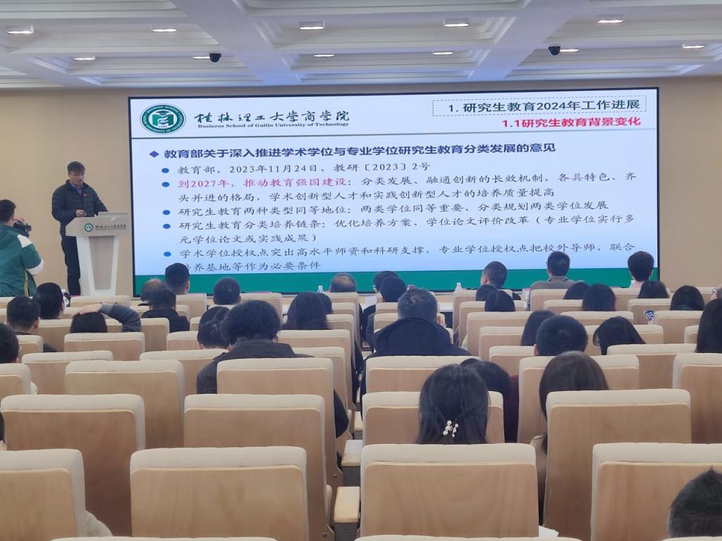 为深入学习宣传和贯彻《中华人民共和国学位法》(以下简称《学位法》),加快推进我院研究生教育高质量发展。商学院2025年1月3日下午2024年度工作总结暨表彰大会上,开展了《学位法》专题学习活动,全体教职工老师参与了此次学习。会议中,分管研究生工作的副院长王兴中对《学位法》进行了全面阐释和深入解读。一是阐述了《学位法》的主要内容及其要点;二是介绍了《学位法》实施后学位授予单位及研究生导师的工作规范和制度方...