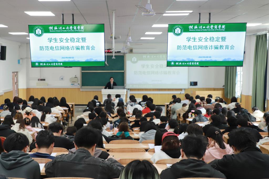 为进一步筑牢校园安全防线,提升学生反诈防骗能力,2025年4月3日,学院在雁山校区召开学生安全稳定暨防范电信网络诈骗教育会。学院党委书记白凌婷,党委副书记、纪委书记饶蠡出席会议,辅导员及雁山校区全体学生党员、班长、团支书、安全委员、心理委员、宿舍长参加会议。会前,学院为全体参会人员发放《商学院学生安全稳定工作指引(学生党员、学生干部版)》材料。工作指引系统梳理了需要重点关注的内容,明确了作为学生干部...