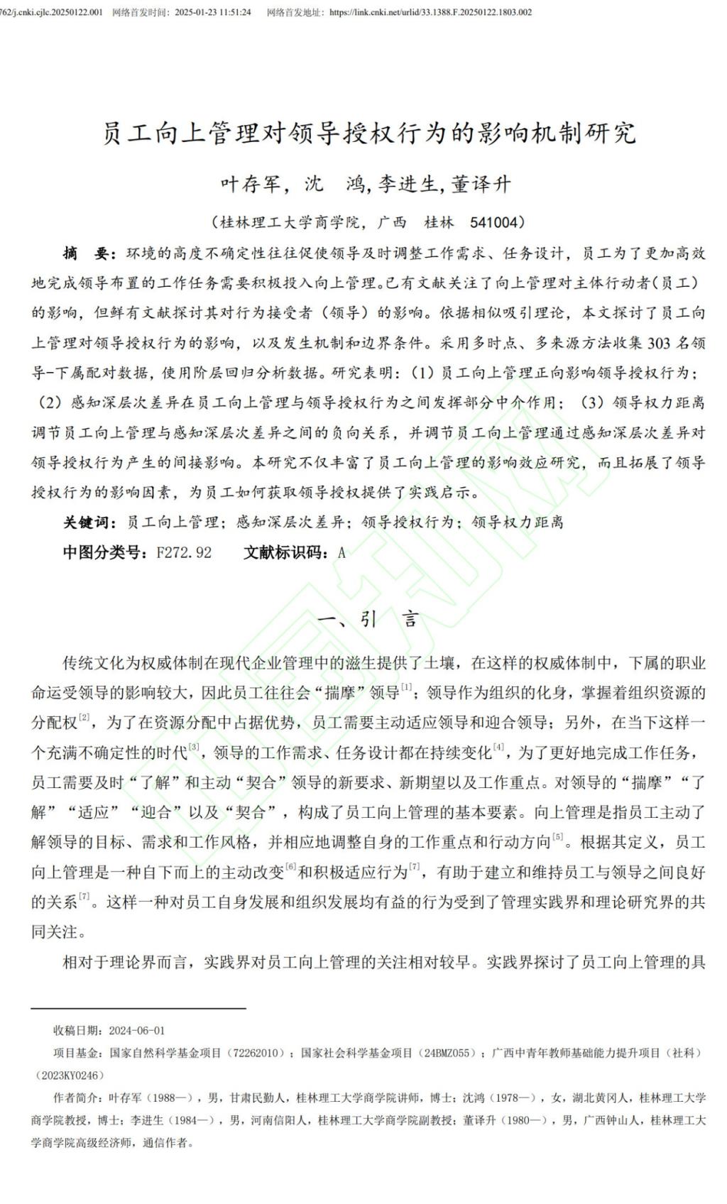 近日,我院叶存军老师团队在组织行为领域的研究取得新进展,研究成果以《员工向上管理对领导授权行为的影响机制研究》为题,在《财经论丛》期刊网络首发。《财经论丛》是由浙江省教育厅主管、浙江财经大学主办的国内外公开发行的经管类学术刊物(月刊),创刊于1985年。《财经论丛》多年来连续入选“中文核心期刊”“CSSCI来源期刊”“AMI综合评价核心期刊”“RCCSE中国核心学术期刊(A)”以及“复印报刊资料重要转载来源期刊...