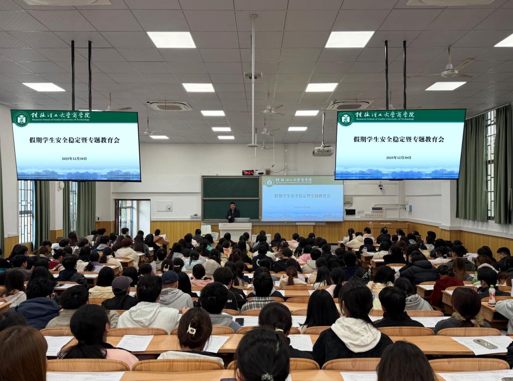 为切实筑牢校园安全防线,强化学生安全防范意识,学院于12月30日在雁山校区06207教室召开假期学生安全稳定暨专题教育会。学院党委书记王璐,学院副院长何雅菲出席会议,全体辅导员及雁山校区学生党员、学生干部参加会议。会前,学院为全体参会人员发放《商学院学生安全稳定工作指引(学生党员、学生干部版)》。工作指引系统梳理了需要重点关注的内容,明确了作为学生干部的日常工作职责和异常情况处理方法,为同学们提供了清晰...