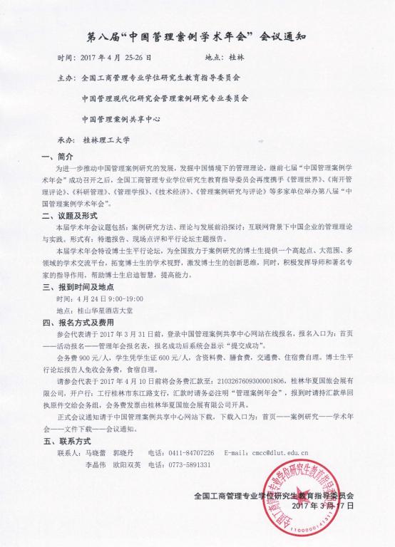 第八届“中国管理案例学术年会”会议通知 时间:2017年4月 25-26日 地点:桂林 主办:全国工商管理专业学位研究生教育指导委员会 中国管理现代化研究会管理案例研究专...
