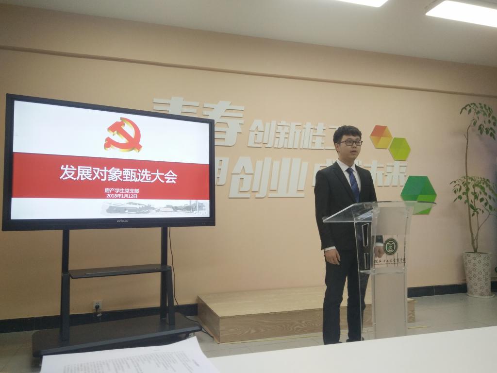 2018年1月12日晚上,我院房产学生党支部在屏风校区7401路演中心举行发展对象甄选大会,房产学生党支部第一书记肖静老师及全体党员作为评委参与大会。会议由支部书记钟颖主持。 本次会议主要对张百强等11名参与甄选的...