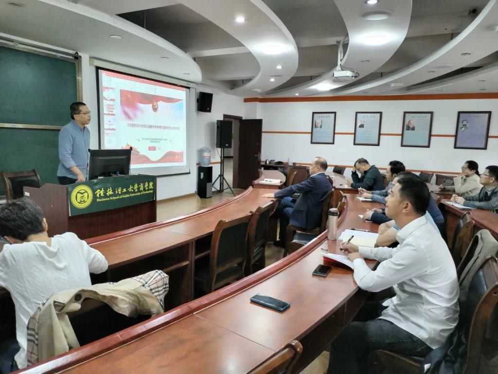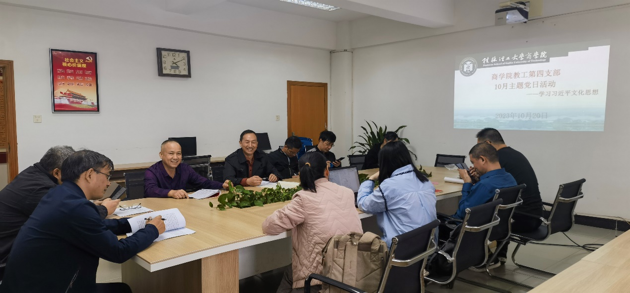 10月20日下午,商学院教工第四党支部在7212开展主题党日活动,认真学习贯彻习近平总书记对宣传思想文化工作作出的重要指示和全国宣传思想文化工作会议精神,深入学习领会习近平文化思想。本次会议由支部书记刘黔川主持。 会上,刘黔川领学《求是》杂志发表习近平总书记重要文章:在文化传承发展座谈会上的讲话,《习近平新时代中国特色社会主义思想学习纲要》,并作学习动员讲话,刘黔川强调,习近平文化思想是对马克思主义文化...